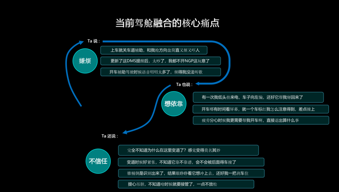 在智能化的过程中,我们需要让用户对智能驾驶产生信任感。针对当前驾舱融合的核心痛点,我们做了从手动驾驶到人机共驾,再到人机切换的用户情绪曲线。我们会找到用户的痛点和机会点,例如对于决策逻辑不信任,过多语音提示导致用户体验下滑等,并通过智能交互真正触达用户。