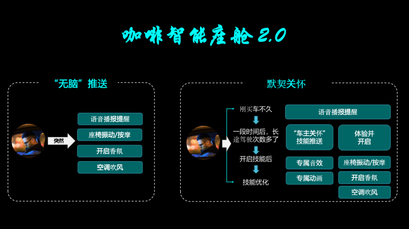 现在我们怎么去做场景推送?我们会在刚买车不久时,用语音播报提醒的方式问你是不是犯困了。当你有了一定时间的了解之后,我们会进行“车主关怀”技能推送,并开启专属音效、座椅按摩等技能。当体验完这个技能之后,如果我们发现用户迅速关闭了空调、香氛等某种技能,便会根据用户数据去调整推送的策略。