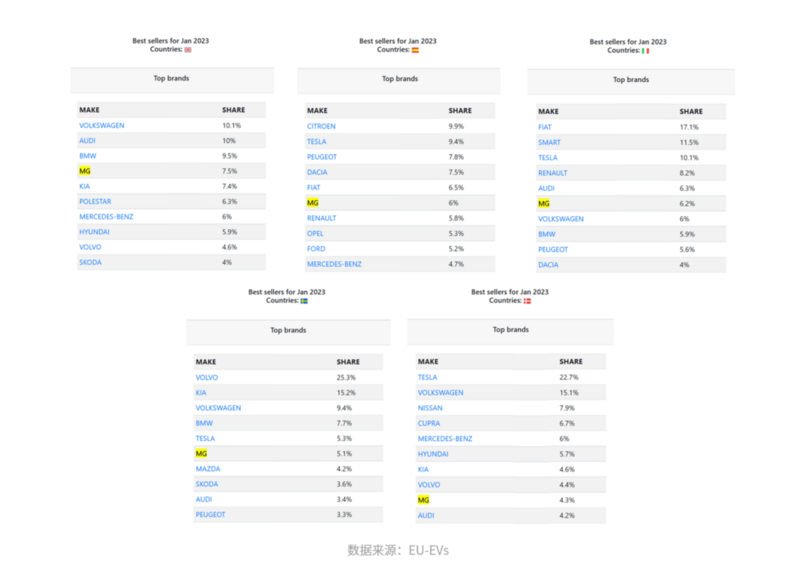 2023年伊始,上汽乘用车旗下产品在欧洲市场一路高歌猛进,持续“攻城略地”,赢得了兔年的“开门红”。EU-EVs2023年1月公开的欧洲多国最新纯电销量数据显示,MG品牌在欧洲市场表现出色,在英国市场榜单中MG进入前五,位列第4;在西班牙、意大利、瑞典三国的市场榜单中,MG均排名第6;在丹麦市场榜单中,MG品牌位列第9。MG品牌以各榜单中前十唯一中国汽车品牌的成绩彰显了自主品牌海外市场的“龙头”担当。