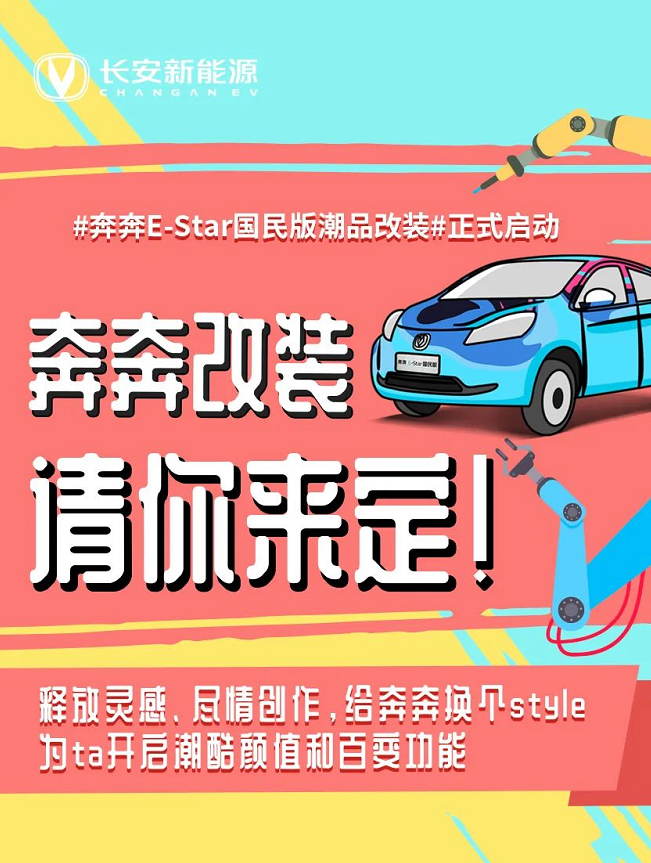 长安新能源的奔奔潮品改装,秉持共玩、共创、共享的初衷,面向全网用户开放,吸引用户全程参与,共同完成。活动启动后迅速吸引了大量年轻人参与,短时间内官方征集到不少非常有想法、有趣味的时尚创意稿,经网友投票,最终角逐排名前五的创意作品被官方采纳,用于实体改装。