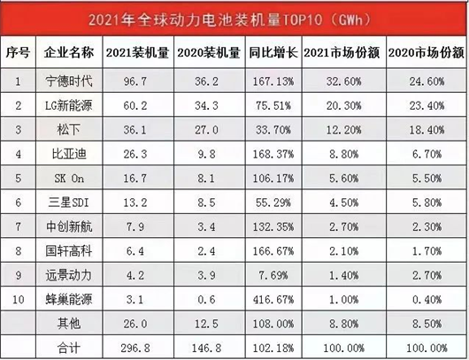 尽管相关情况未知,但有一点可以确定,在韩国市场研究机构SNE Research的数据中,2021年全球动力电池装机量的排名前十中,并没有发现美国电池厂商的身影。
