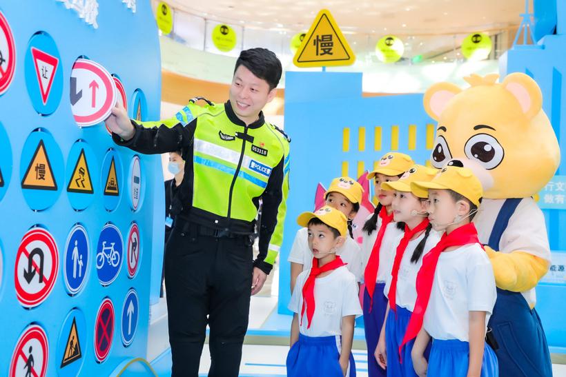 交警在“安安驾校”为小朋友讲解交通安全标识