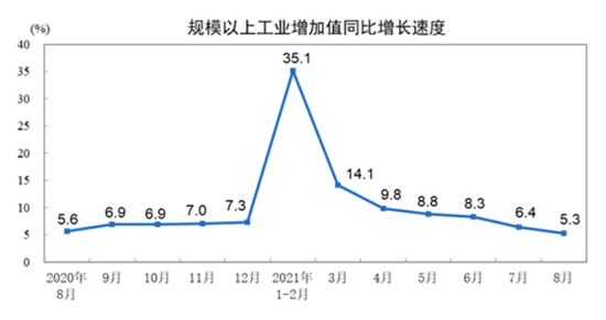 昨日,国家统计局发布数据显示,8月,全国规模以上工业增加值同比增长5.3%,两年平均增长5.4%,比7月份回落0.2个百分点;环比增长0.31%。1-8月,全国规模以上工业增加值同比增长13.1%,两年平均增长6.6%。