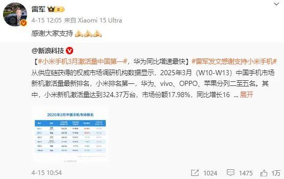 同日,雷军久违发博,却是转发某媒体《小米手机3月激活量中国第一》的短文,表示“感谢大家支持”,再无多余的话。理论上来说,截至目前,雷军已经有10天没有发布原创博文,缺少了往日的生机,在各家车企都大力推广自家的新品时,延迟发布的YU7,让小米汽车错失了最佳战机。