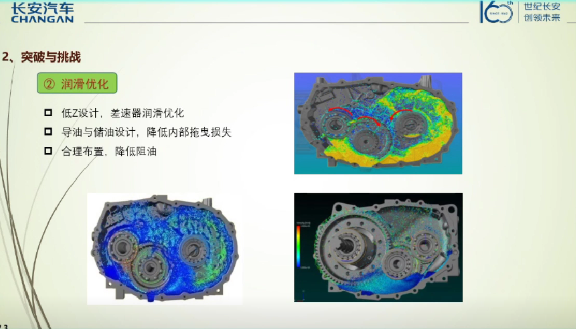 另一大挑战是对差速器进行润滑优化。通过CFD模拟仿真以及台架实验验证,首先要强化壳体光滑度,提高液体流速;除此以外,不仅要在壳体上导油,也要对差速器内部添加储油措施:比如在容积在0.4升的专门储油枪,在转速处于1200-1400转区间时,储油可以将齿轮间用于循环的油量降低百分之三十多。
