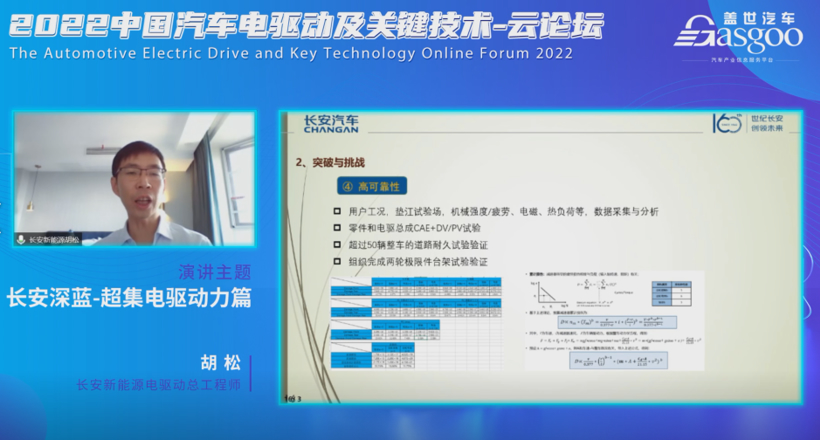 为保证用户的可靠性,长安汽车对用户工况、机械强度/疲劳,热负荷等进行采集和分析,对产品设计速度作总结,同时通过实验验证进行复合;针对零件和电驱总成的可靠性,则是基于长安的开发体系完成了PV的实验验证。