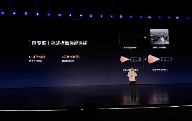 发布会上,比亚迪展示未来传感链上增加红外传感器和4D毫米波雷达,增强夜间和距离感知的能力。