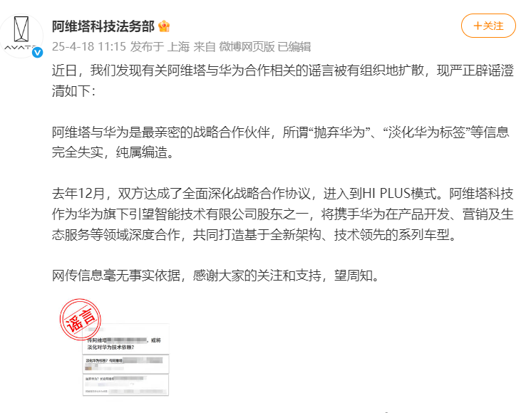 4月18日,阿维塔法务部发布消息称,近日,公司发现有关阿维塔与华为合作相关的谣言被有组织地扩散,现严正辟谣澄清。