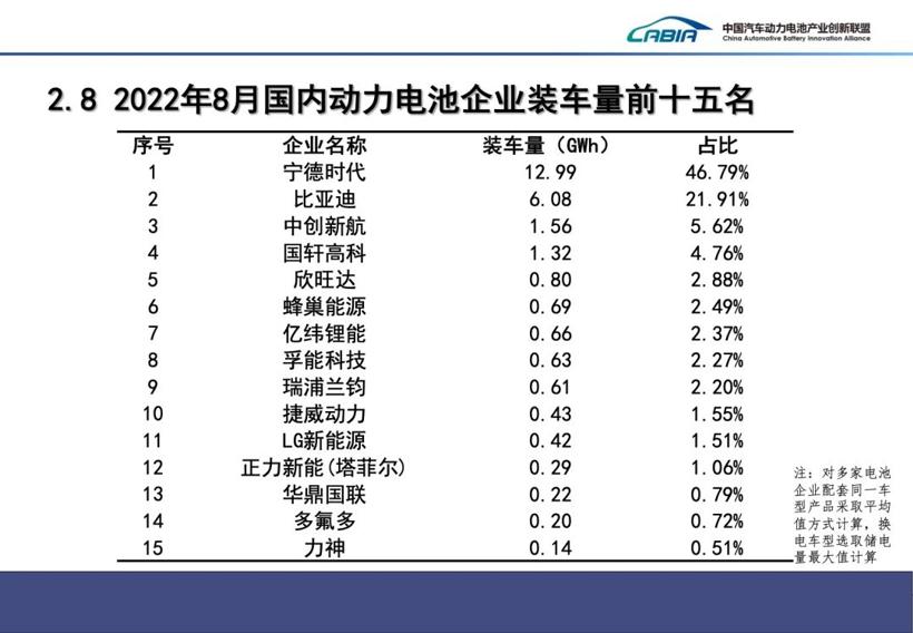 中国汽车动力电池产业创新联盟发布的最新数据显示,宁德时代以 46.79% 的占比稳居第一,比亚迪、中创新航(中航锂电)分别以 21.91%、5.62% 的占比位居二、三位。