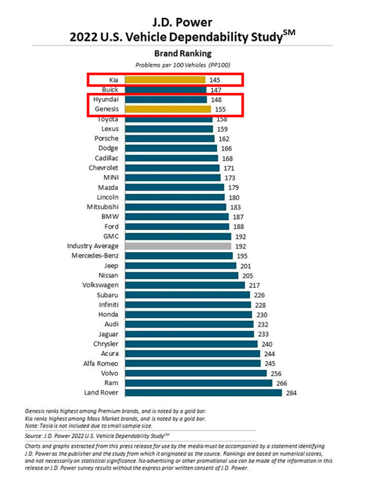 同样,现代汽车在可靠性方面的表现也让人刮目相看。现代汽车集团已经连续两年在J.D.Power“车辆可靠性研究”中排名第一。在这项美国权威质量调查机构进行的研究中,2022年现代汽车集团旗下的起亚、现代、捷尼赛思分别摘得可靠性排名的第一、第三和第四名。